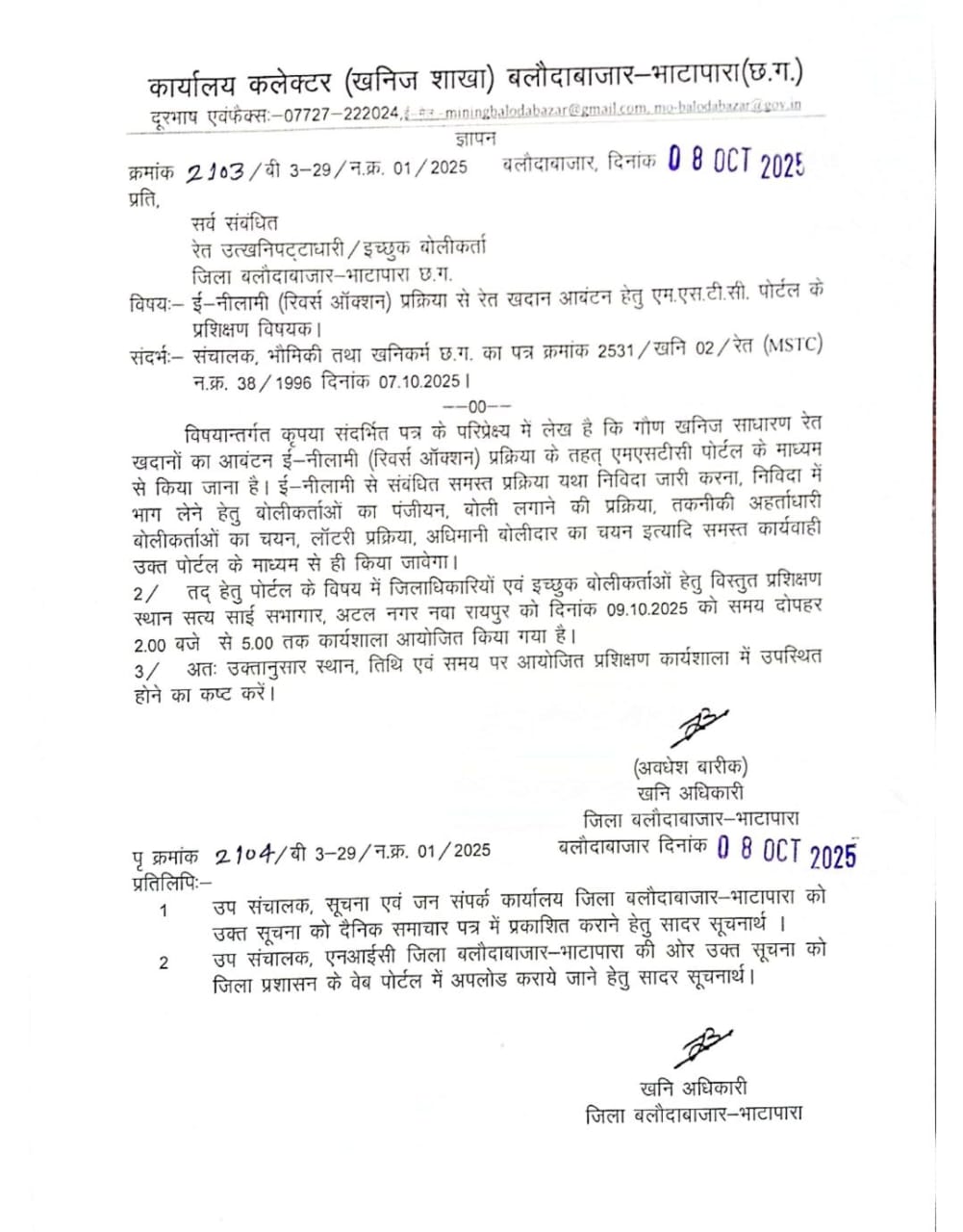 खनिज विभाग ने सभी संबंधित जिलाधिकारियों, खनिज अधिकारियों, तकनीकी सहायकों और इच्छुक बोलीकर्ताओं से आग्रह किया है कि वे समय पर प्रशिक्षण सत्र में उपस्थित होकर पोर्टल की प्रक्रिया की जानकारी प्राप्त करें, ताकि भविष्य में रेत खदानों की नीलामी से जुड़ी कार्यवाही सुचारू रूप से संचालित की जा सके।