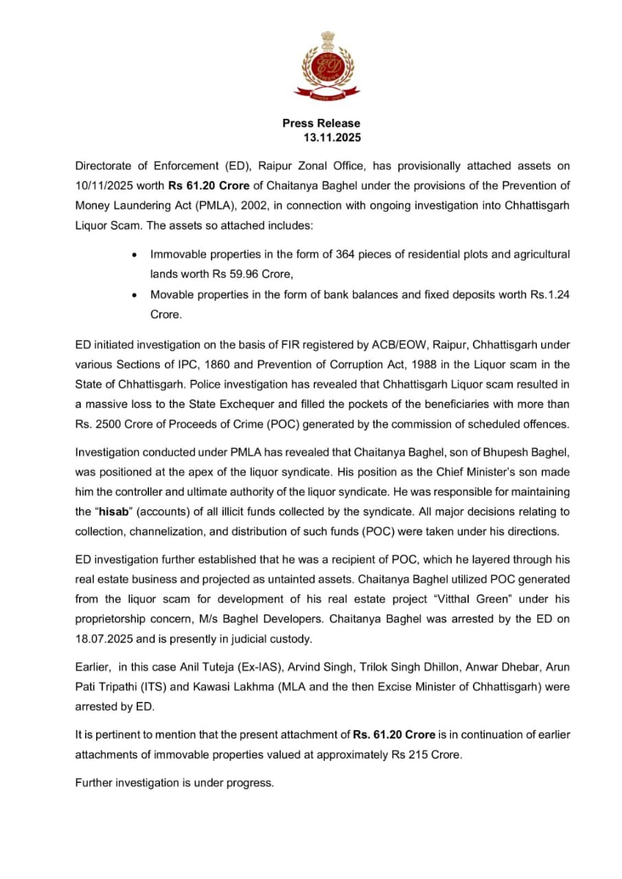 ईडी ने चैतन्य बघेल की 61 करोड़ की संपत्ति अटैच की शराब घोटाले में मनी लॉन्ड्रिंग की कार्रवाई, 364 प्लॉट और खेत के टुकड़े जब्त