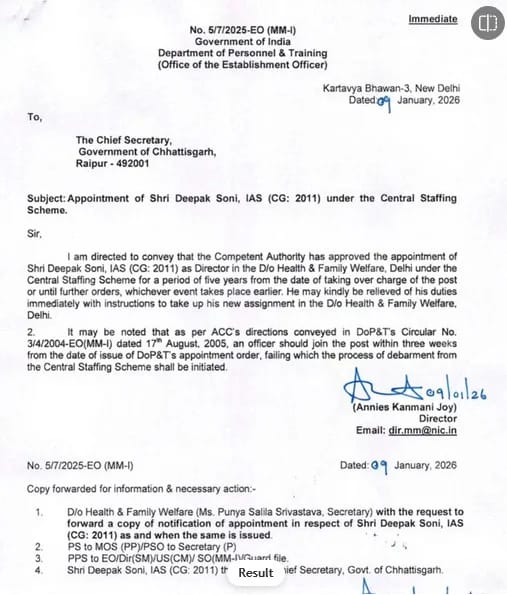 एक और IAS अधिकारी का केंद्र सरकार में चयन होना छत्तीसगढ़ प्रशासन की साख को मजबूत करता है। इससे पहले भी राज्य कैडर के कई अधिकारियों ने केंद्रीय प्रतिनियुक्ति पर जाकर विभिन्न मंत्रालयों में उल्लेखनीय सेवाएं दी हैं। दीपक सोनी की नियुक्ति को राज्य के प्रशासनिक अनुभव और कार्यकुशलता की पहचान के रूप में देखा जा रहा है।