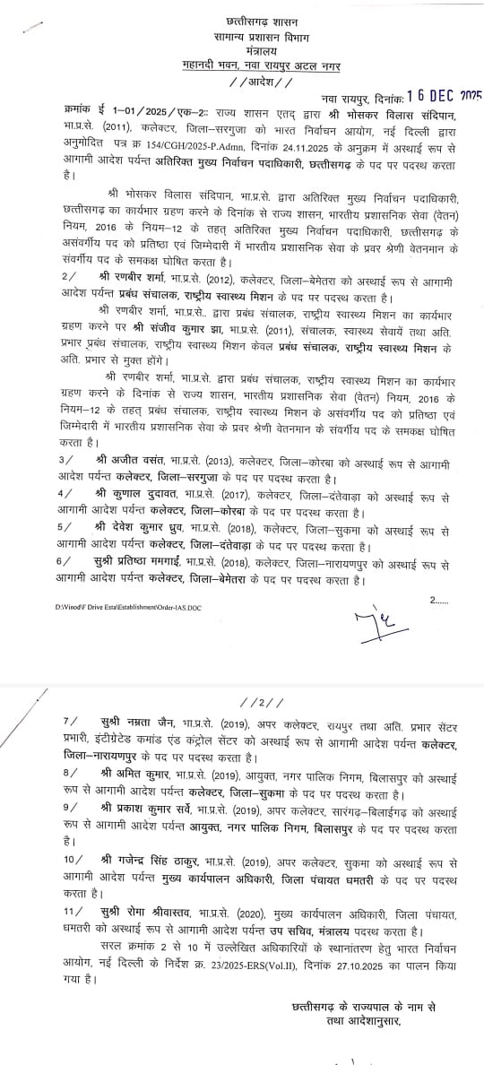 नवा रायपुर, । छत्तीसगढ़ शासन ने भारतीय प्रशासनिक सेवा (IAS) के अधिकारियों के तबादले एवं पदस्थापना को लेकर बड़ा आदेश जारी किया है। सामान्य प्रशासन विभाग द्वारा जारी आदेश के अनुसार राज्य में कई जिलों के कलेक्टर बदले गए हैं, वहीं कुछ अधिकारियों को अतिरिक्त दायित्व भी सौंपे गए हैं।