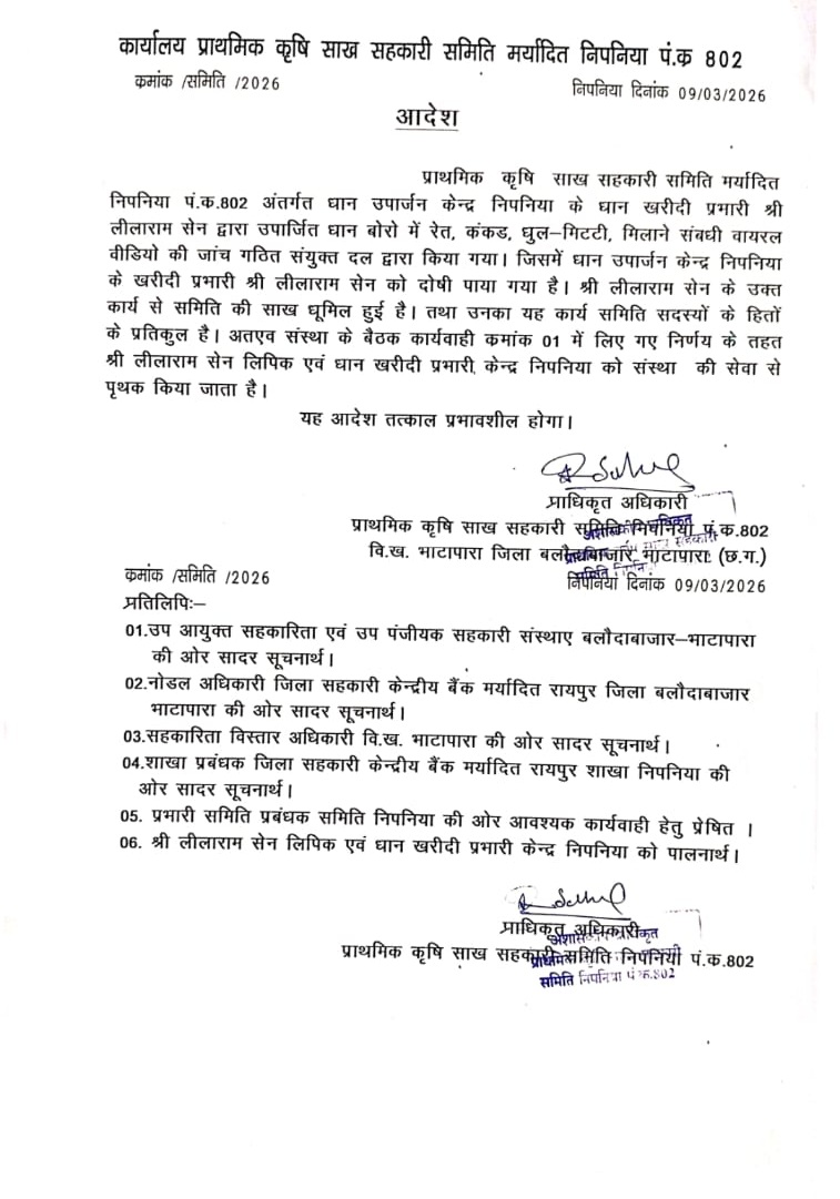 भाटापारा: निपनिया धान खरीदी केंद्र में धान के बोरों में रेत, कंकड़ और धूल-मिट्टी मिलाने के वायरल वीडियो और इस मामले को बी बी एन 24 न्यूज द्वारा प्रमुखता से उठाए जाने के बाद आखिरकार सहकारिता विभाग हरकत में आया और धान खरीदी केंद्र के प्रभारी लीलाराम सेन को पद से बर्खास्त कर दिया गया। प्राथमिक कृषि साख सहकारी समिति मर्यादित निपनिया द्वारा जारी आदेश में उनके कृत्य को समिति की साख को धूमिल करने वाला बताते हुए तत्काल प्रभाव से सेवा से पृथक कर दिया गया है।