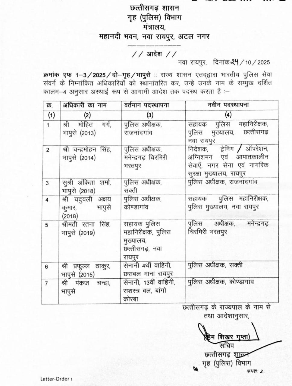 छत्तीसगढ़ पुलिस विभाग में बड़ा प्रशासनिक फेरबदल — सात आईपीएस अधिकारियों का तबादला आदेश जारी