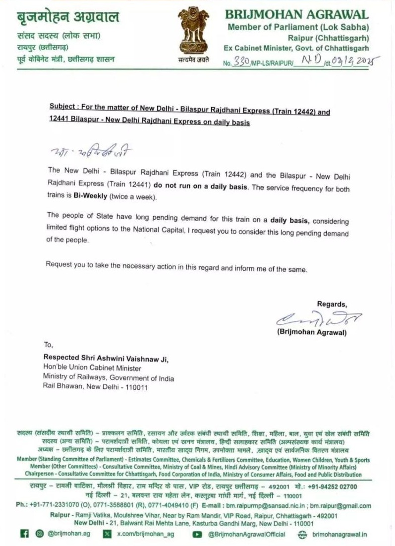 रायपुर: छत्तीसगढ़ की राजधानी और उत्तर भारत के बीच बेहतर रेल कनेक्टिविटी सुनिश्चित करने के लिए बिलासपुर–नई दिल्ली राजधानी एक्सप्रेस को दैनिक चलाने की मांग उठी है। प्रदेश के प्रतिनिधिमंडल ने संसद में केंद्रीय रेल मंत्री अश्विनी वैष्णव से मुलाकात कर राजधानी एक्सप्रेस की फ्रीक्वेंसी बढ़ाने का अनुरोध किया।