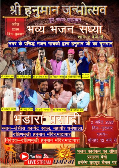 भाटापारा। पवनपुत्र, संकटमोचन भगवान श्री हनुमान जी के पावन जन्मोत्सव के अवसर पर भाटापारा में 01 एवं 02 अप्रैल 2026 को दो दिवसीय भव्य धार्मिक आयोजन किया जाएगा। इस अवसर पर दक्षिणमुखी हनुमान मंदिर परिसर, महावीर धर्मशाला, स्टेशन रोड में भजन संध्या, महा आरती एवं विशाल भंडारे का आयोजन रखा गया है।