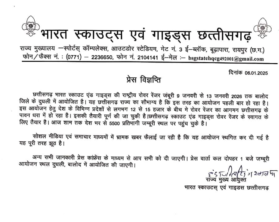 आयोजन से जुड़ी विस्तृत जानकारियां साझा करने के लिए कल दोपहर 1 बजे जंबूरी स्थल दुधली, जिला बालोद में एक प्रेस कॉन्फ्रेंस आयोजित की जाएगी, जिसमें कार्यक्रम की रूपरेखा, गतिविधियों और व्यवस्थाओं की जानकारी दी जाएगी।