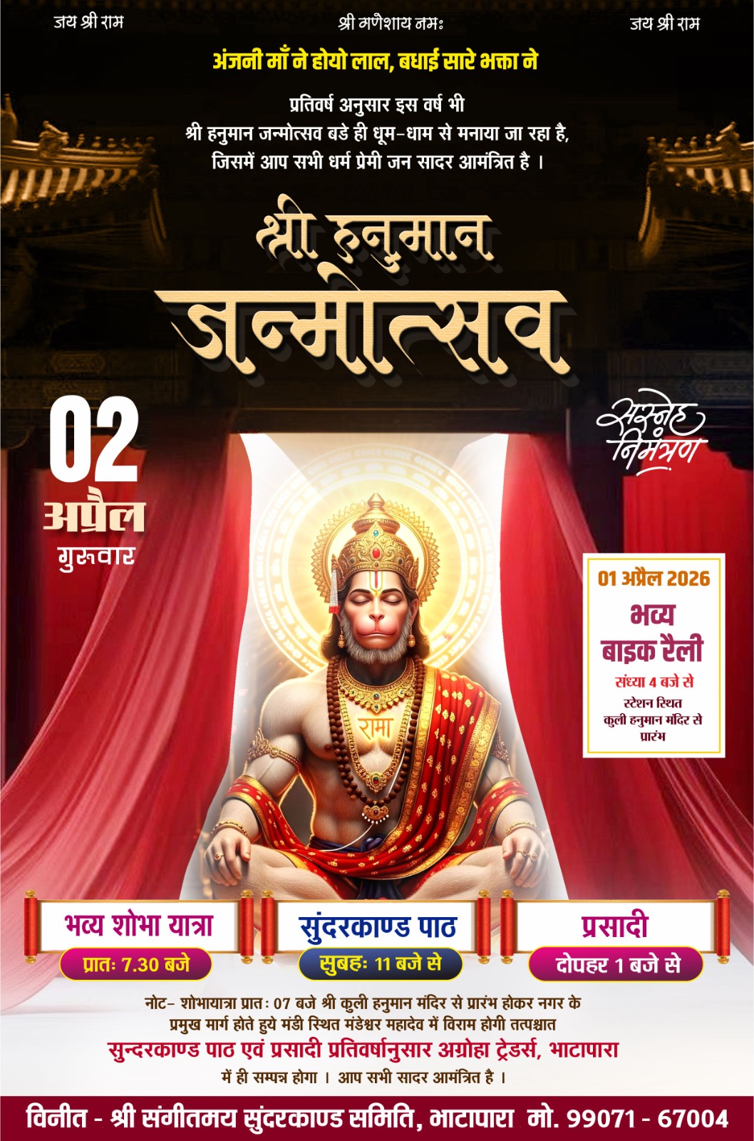 वहीं, एक दिन पहले 1 अप्रैल 2026 को शाम 4 बजे भव्य बाइक रैली का आयोजन भी रखा गया है, जो कुली हनुमान मंदिर से प्रारंभ होगी।आयोजन श्री संगीतिमय सुंदरकांड समिति, भाटापारा द्वारा किया जा रहा है, जिसमें सभी धर्मप्रेमी नागरिकों से अधिक से अधिक संख्या में शामिल होकर आयोजन को सफल बनाने की अपील की गई है।