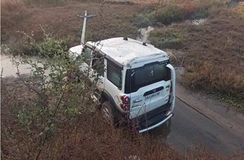 तेज रफ्तार स्कॉर्पियो बिजली खंभा तोड़ते हुए 10 फीट गड्ढे में गिरी, बड़ा हादसा टला